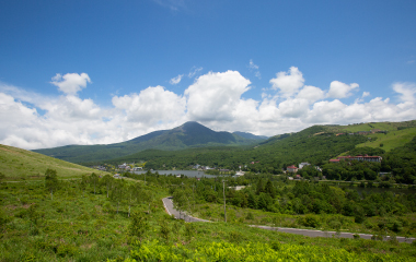 標⾼1400mを超えるさわやかな⾼原と、穏やかに佇む⽩樺湖。