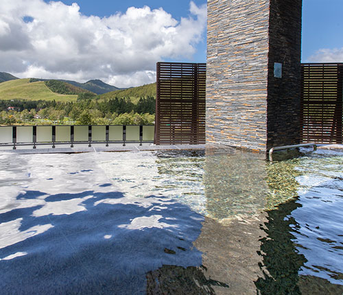 新本館に新たに誕生した「湖天の湯」では、男女入れ替え制の内湯「石の湯」と「木の湯」、雄大な景色を混浴でたのしむ「湖畔混浴 空」などが備わり、樽ヶ沢温泉の湯を心ゆくまで堪能できます。